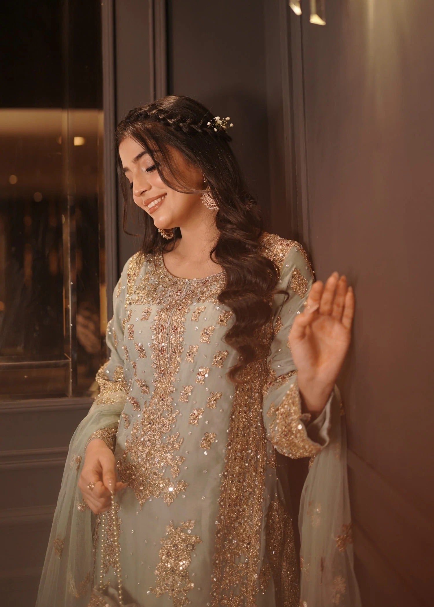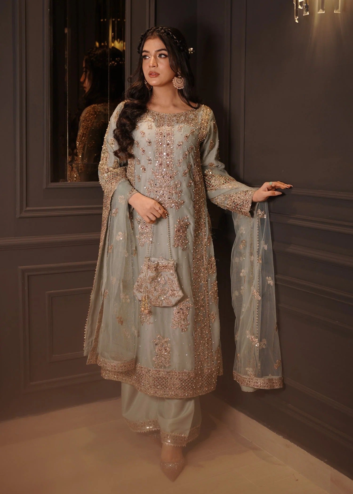 Introducing "Anishka", a blue ensemble featuring a long shirt and flared trousers. The front of the shirt is intricately adorned with golden zari work and embroidery, combined with delicate bead and sequin work. The embellishments are designed in floral and geometric patterns, and the same design is used on the sleeves. The matching flared trousers are simple and embroidered at the hem, which adds to the charm of the entire outfit. The ensemble is completed with a rich dupatta, adorned with heavy embroidery along the borders. Choose "Anishka" to make your festive events special.